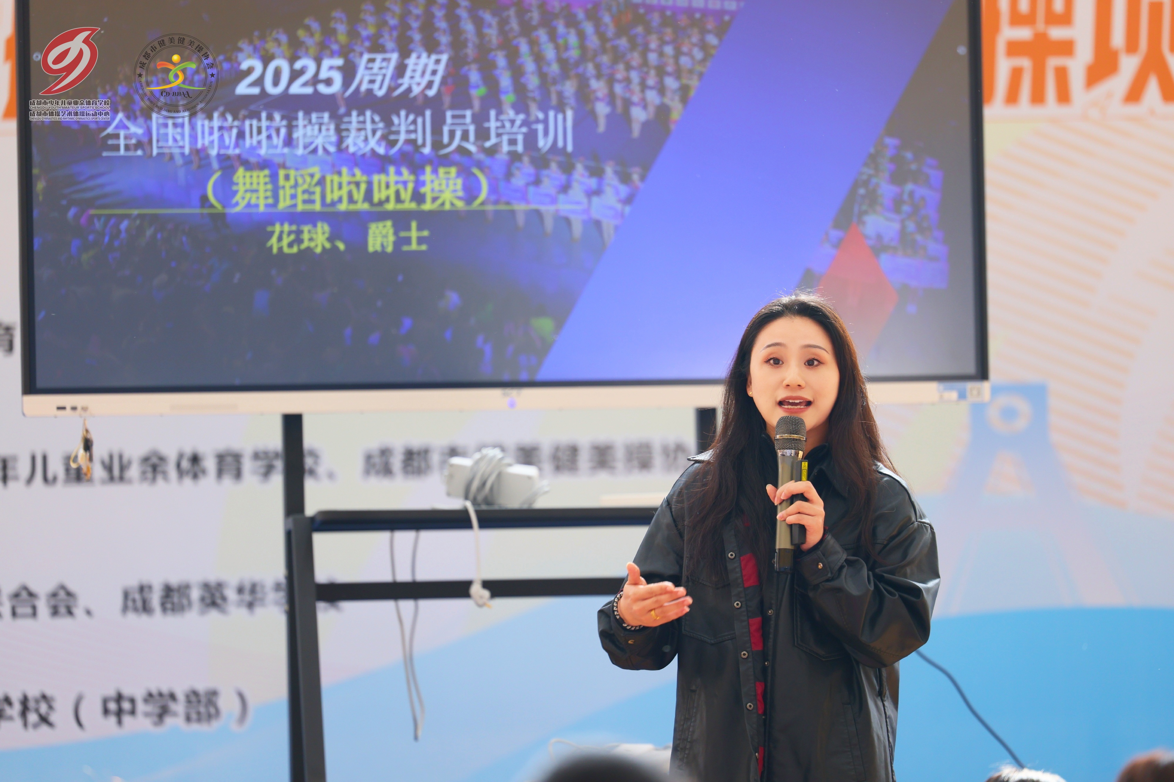 开班仪式上,成都市健美健美操协会负责人总结了2025年全市校园健美操、啦啦操项目推广成果,并介绍了2026年校园体育赛事及师资培训整体规划。本次培训紧扣一线教学需求,采用“理论+实践”相结合的教学模式,组建了由体操世界冠军、国家级裁判领衔的高规格讲师团队,围绕健美操基础步伐与组合编排、啦啦操团队配合与表现力提升、韵律操音乐选择与动作创编三大核心模块展开系统教学与现场示范。